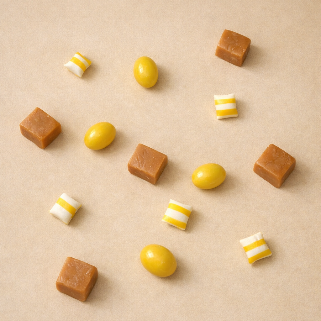 60 g Almas Polkagriskokeri Fläderkarameller Socker, glukossirap, surhetsreglerande medel, äppelsyra, aromer, färgämne E100.